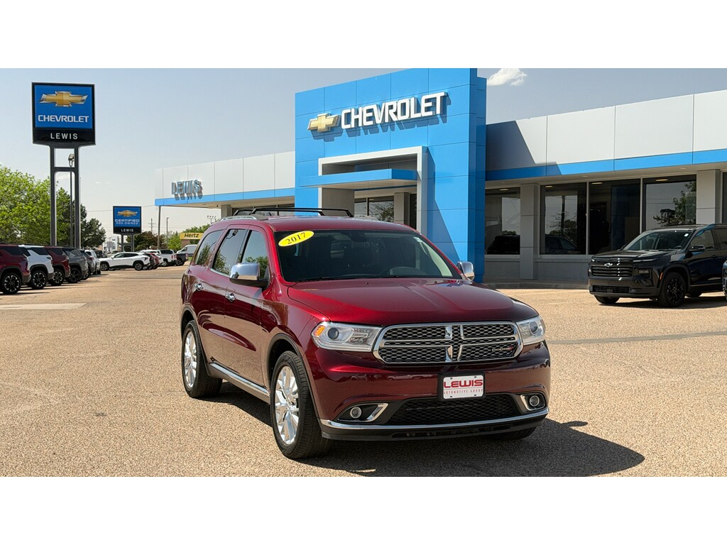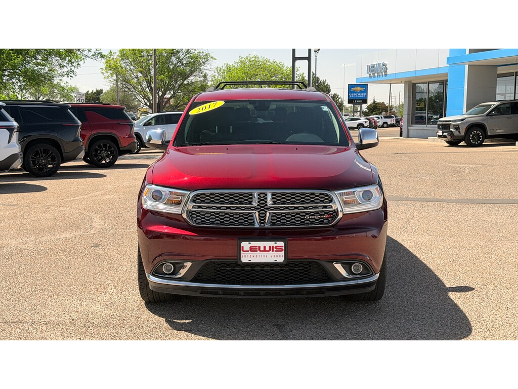 The Dodge Durango features a hands-free Bluetooth phone system. This 2017 Dodge Durango keeps you comfortable with Auto Climate. Enjoy the incredible handling with the rear wheel drive on this 2017 Dodge Durango . Set the temperature exactly where you are most comfortable in this Dodge Durango. The fan speed and temperature will automatically adjust to maintain your preferred zone climate. The Dodge Durango excites both driver and bystanders with a polished red exterior with racy lines. This Dodge Durango has a V6, 3.6L high output engine. With the keyless entry system on this model you can pop the trunk without dropping your bags from the store. This Dodge Durango comes with third row seating for extra passengers. This model has an automatic transmission. The fog lights cut through the weather so you can see what's ahead. The Electronic Stability Control will keep you on your intended path. The FlexFuel capability of the vehicle allows you to select fuel depending on the price of E85 versus gasoline.